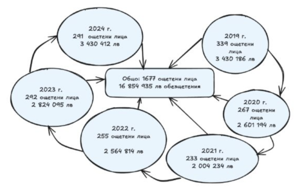 През последните шест години 1677 човека са осъдили прокуратурата да им плати обезщетения за вреди по реда на чл. 2 от Закона за отговорността на държавата и общините за вреди (ЗОДОВ) – най-често вредите са от незаконно обвинение и/или нарушаване правото на свобода и сигурност. Това прави средно по 280 човека годишно. За да вникнем в сухата статистика по-добре, нека си представим, че всеки ден от работната седмица (общо около 250 работни дни годишно)- от понеделник до петък, поне един човек (понякога и двама) е пострадал от това, че е обвинен в престъпление, което не е извършил и/или е несправедливо лишен от свобода.