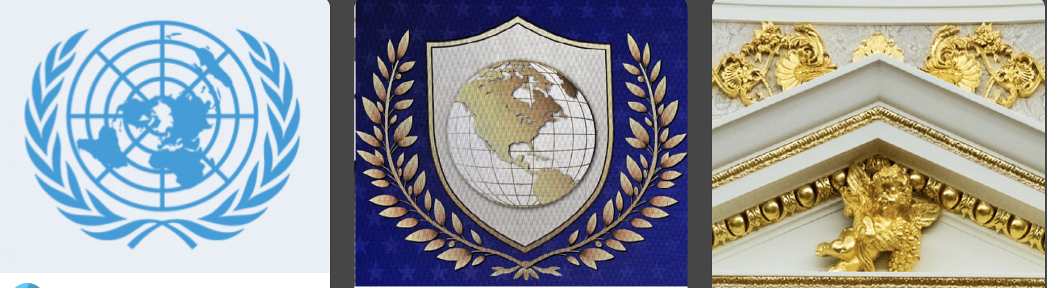 Логото на Съвета за мир на Тръмп (в средата), което можеше да бъде видяно по време на годишната среща на Световния икономически форум в Давос, Швейцария на 22 януари 2026 г., забележително прилича на логото на Организацията на обединените нации (вляво), на която Съветът за мир изглежда си поставя за цел да бъде алтернатива. И двете лога изобразяват глобус, ограден от маслинови клонки. Докато логото на ООН изобразява всички шест населени континенти, логото на Съвета за мир на Тръмп включва само Северна и Южна Америка, като поставя САЩ в центъра на изображението. Вместо синьото на ООН, логото на Съвета за мир има златна цветова схема – Тръмп е известен с обсесията си по златните тонове, които преобладават в собствената му резиденция, а след като се завърна на президентския пост миналата година – и в Овалния кабинет на Белия дом. (Колаж: Електронен съдник.)