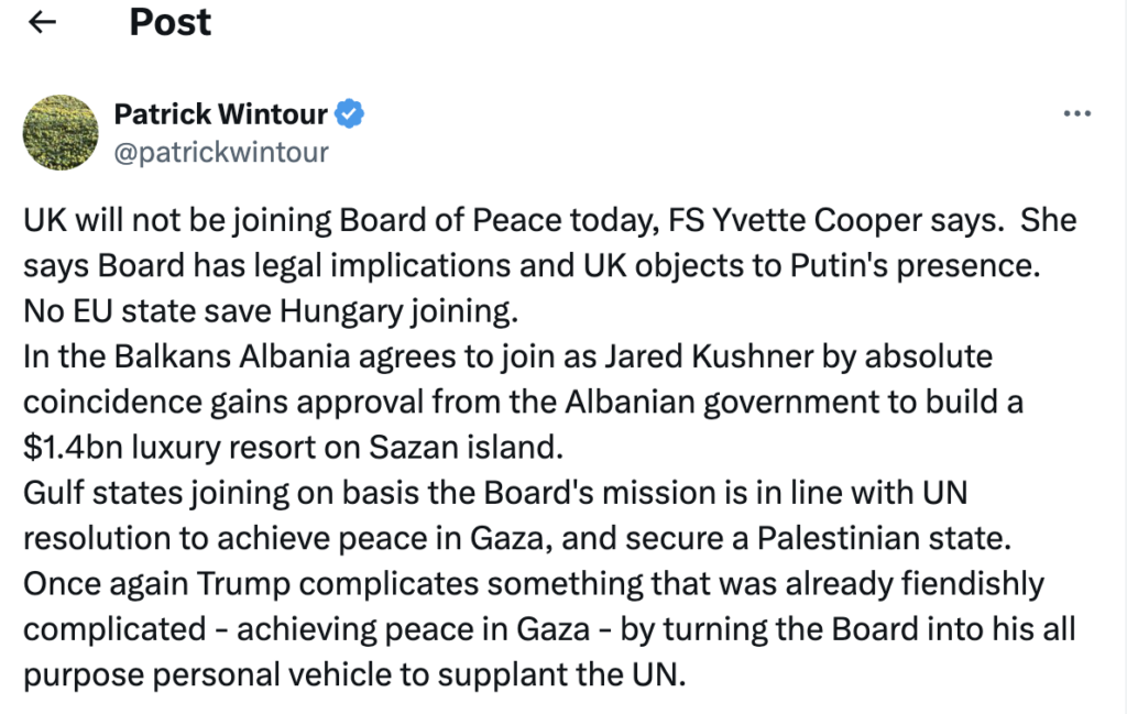 Макар Европейските лидери да подкрепят резолюция 2803, с изключение на България и Унгария, те се въздържат от присъединяване към Съвета за мир на Тръмп. Причините за това изглежда са нескритата критика и предизвикателство към ООН, управлението и посочването на наследник от Тръмп за властта над съвета, финансовите ангажименти на държавите членки, конкуренцията с ООН, участието в него на лидери и държави с диктаторски уклон.