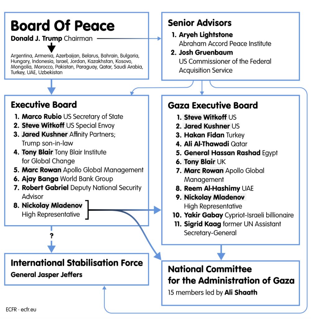 Сред членовете на изпълнителния съвет са висши американски служители и бизнесмени: Джаред Кушнер, зет на Тръмп и основател на Affinity Partners, американска инвестиционна фирма с тесни връзки с близкоизточни фондове; Марк Роуан, главен изпълнителен директор на фирмата за управление на активи Apollo Global Management, която инвестира в частен капитал и недвижими имоти; Аджай Банга, друг бизнес ръководител и президент на Групата на Световната банка.