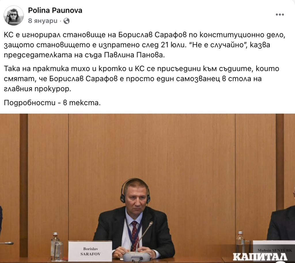 По данни на журналистката Полина Паунова, след 21 юли 2025 г. дори Конституционният съд игнорира становищата на Борислав Сарафов по конституционни дела. Като пример е посочено решение №12 по дело №7 от 2025 г., което формално е свързано с текстове от Закона за административните нарушения и наказания, засягащи глобите, налагани по този ред. Ключовото в това решение обаче е друго: както по всяко конституционно дело, заинтересованите институции са поканени да дадат своите становища. Видно от документацията на страницата на КС, такова становище е подал, като и. ф. главен прокурор и Борислав Сарафов. То обаче е депозирано на 7 август 2025 г., т.е. когато, ако беше спазен Закона за съдебната власт, той вече трябваше да е освободил „и. ф.“ поста. Становището на Сарафов е публикувано на страницата на КС, но в самото решение аргументите на Сарафов не са отбелязани. Всички останали мнения без неговото са обсъдени подробно.