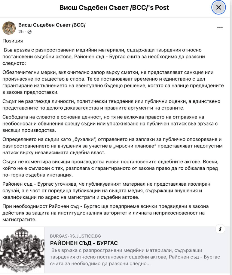 Последва възмутена реакция от Районен съд – Бургас, според която „определянето на съдии като „бухалки“, отправянето на заплахи за публично опозоряване и разпространението на внушения за участие в „мръсни планове“ представляват недопустим натиск върху независимата съдебна власт“. Висшият съдебен съвет разпространи позицията на Районен съд – Бургас и във Фейсбук.