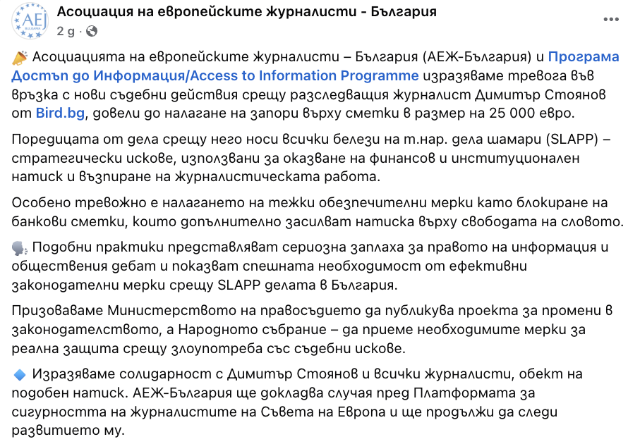Асоциацията на европейските журналисти излезе с позиция в защита на журналиста.