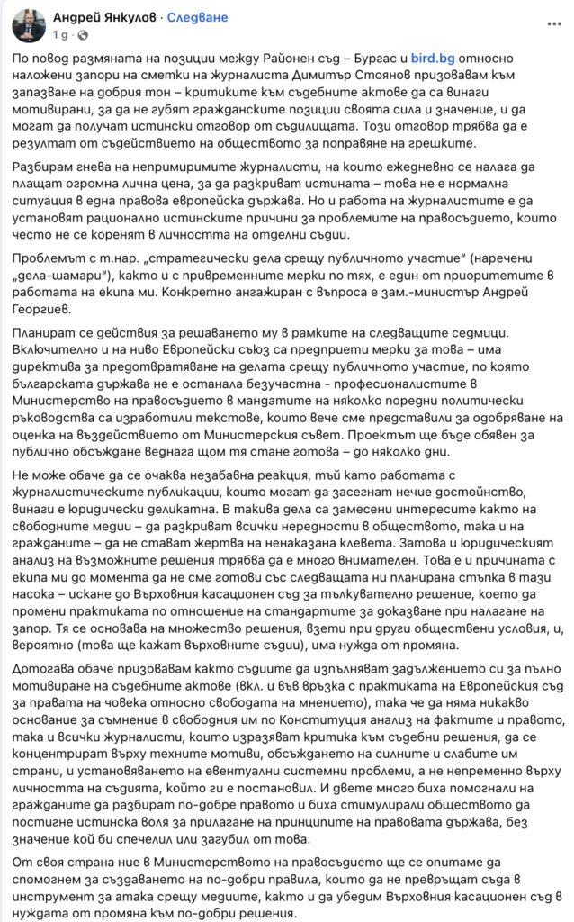 Служебният министър на правосъдието Андрей Янкулов призова от профила си във Фейсбук към запазване на добрия тон. Той посочи, че проблемът с т.нар. „стратегически дела срещу публичното участие“ (наречени „дела-шамари“), както и с привременните мерки по тях, е един от приоритетите в работата на екипа му. Конкретно ангажиран с въпроса е зам.-министър Андрей Георгиев. Планират се действия за решаването на проблема в рамките на следващите седмици, като включително на ниво Европейски съюз са предприети мерки за това – има директива за предотвратяване на делата срещу публичното участие, по която българската държава не е останала безучастна – професионалистите в Министерство на правосъдието в мандатите на няколко поредни политически ръководства са изработили текстове, които вече са представени за одобряване на оценка на въздействието от Министерския съвет. Проектът ще бъде обявен за публично обсъждане до няколко дни.