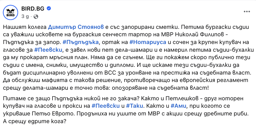 По-рано през седмицата bird.bg излезе с позиция, в която нарече съдиите, които са се произнесли по пет от делата, „съдии–бухалки“ и призова за тяхното дисциплинарно уволнение от ВСС за уронване на престижа на съдебната власт.