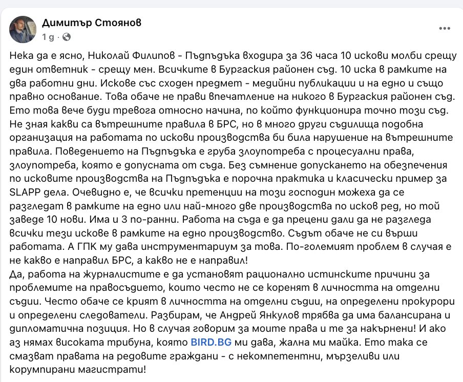 Журналистът Димитър Стоянов от bird.bg обяви, че е ответник по десет нови искови молби, заведени от Николай Филипов „Пъдпъдъка“ в Районен съд – Бургас в рамките на 36 часа, като има и три по-ранни. Исковете са със сходен предмет – медийни публикации, и на едно и също правно основание. Съдът е допуснал обезпечения на исковете и е наложил запори на сметки на журналиста. Според него това е груба злоупотреба с процесуални права, която е допусната от съда, въпреки че стана дума за порочна практика и класически пример за SLAPP дела.
