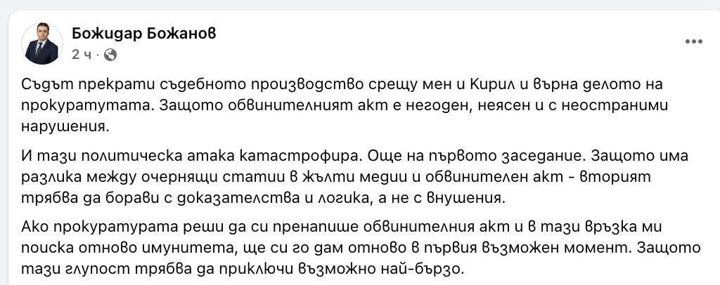 „Съдът прекрати съдебното производство срещу мен и Кирил и върна делото на прокуратурата. Защото обвинителният акт е негоден, неясен и с неостраними нарушения.