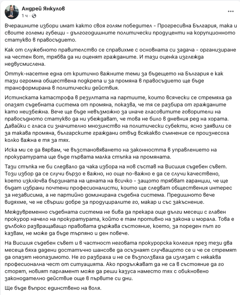 Андрей Янкулов призова първата стъпка на новото управление да бъде възстановяването на законността в управлението на прокуратурата, което може да се случи само чрез смяната на Борислав Сарафов на поста и. ф. главен прокурор. Според Янкулов тази „малка“ стъпка“ не бива да чака избора на нов Висш съдебен съвет, тъй като този избор е по-важно да се случи качествено, отколкото бързо бързо.
