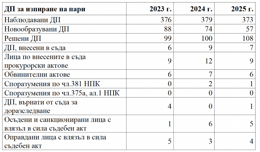 Общият брой на досъдебните производства за изпиране на пари по чл. 253 НК през последните три години се запазва почти напълно – 373 бр. през 2025 г., 379 бр. през 2024 г. и 376 бр. през 2023 г. Новообразуваните са 57 бр.