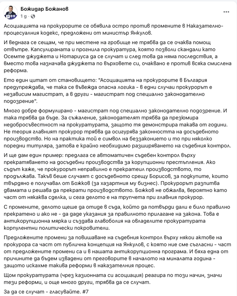 Същевременно Асоциацията на прокурорите незабавно реагира на критиките към прокуратурата, които активният в предизборната си кампания кандидат депутат от ПП–ДБ Божидар Божанов, публикува вчера във Фейслук. Ето пълния текст на позицията на Божидар Божанов: