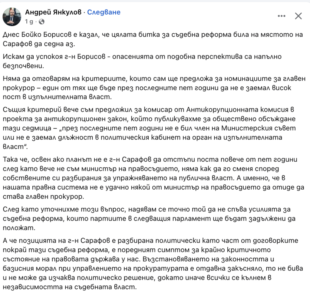 Днес Бойко Борисов е казал, че цялата битка за съдебна реформа била на мястото на Сарафов да седна аз. Искам да успокоя г-н Борисов – опасенията от подобна перспектива са напълно безпочвени. Няма да отговарям на критериите, които сам ще предложа за номинациите за главен прокурор – един от тях ще бъде през последните пет години да не е заемал висок пост в изпълнителната власт. Същия критерий вече съм предложил за комисар от Антикорупционната комисия в проекта за антикорупционен закон, който публикувахме за обществено обсъждане тази седмица – „през последните пет години не е бил член на Министерския съвет или не е заемал длъжност в политическия кабинет на орган на изпълнителната власт“. Така че, освен ако планът не е г-н Сарафов да отстъпи поста повече от пет години след като вече не съм министър на правосъдието, няма как да го сменя според собствените си разбирания за упражняването на публична власт. А именно, че в нашата правна система не е удачно някой от министър на правосъдието да отиде да става главен прокурор. След като уточнихме този въпрос, надявам се точно той да не спъва усилията за съдебна реформа, които партиите в следващия парламент ще бъдат задължени да положат. А че позицията на г-н Сарафов е разбирана политически като част от договорките покрай тази съдебна реформа, е поредният симптом за крайно критичното състояние на правовата държава у нас. Възстановяването на законността и базисния морал при управлението на прокуратурата е отдавна закъсняло, то не бива и не може да изчаква политическо решение, докато иначе всички се кълнем в независимостта на съдебната власт.