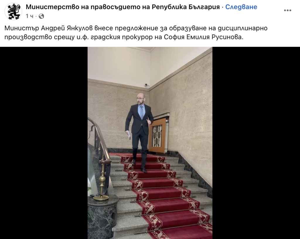 Министър Андрей Янкулов обяви днес, че е внесъл предложението за образуване на дисциплинарно производство спрямо изпълняващата функциите на градски прокурор на София г-жа Емилия Русинова. Ето какво още каза той на брифинга в сградата на на Министерството на правосъдието : „Аргументите, които са изложени в това предложение – има осъществени две пътувания от г-жа Русинова, – преминавания през границата на страната, с един и същи автомобил с лицата Петьо Петров и Кристиян Христов. Това се случва към дати към 2021 г. на месец юни и месец август. Тоест това е по времето, по което историята с „Осемте джуджета“ е публично известна в продължение на около година, от една страна. От друга страна, по това време – лятото на 2021 г., вече има публична информация, а и вътре информация в самата прокуратура за образувани различни прокурорски преписки в различни прокуратури, но включително в Софийска градска прокуратура (СГП), по които да се изяснява фактологията около казуса „Осемте джуджета“. Даже едната преписка е образувана няколко дни след публикуване на първата част на „Осемте джуджета“ през юни 2020 г. и информация за образуването на тази преписка е публикувана на сайта на ПРБ, т. е. това е и публична информация, не само служебно известна на прокурорите от прокуратурата, че такава някаква преписка е водена в СГП. По времете, по което са осъществени тези пътувания, г-жа Русинова е заемала поста заместник на апелативния прокурор на София. Тоест, като част от ръководството на Апелативна прокуратура, самата тя потенциално е могла да осъществява контролни правомощия върху работата на прокурорите от СГП и съответно тук се създава този риск от потенциално въздействие възможно върху тези прокурори. Естествено, такава информация към този момент няма. Но дори самият факт, че заместник на горестоящата прокуратура е в тесен контакт с лица, които към този момент са били проверявани от долустоящата прокуратура, е достатъчно притеснителен за мен. Освен факта на двете пътувания, има и друга информация, която показва, че това не са изолирани случаи, изолирани контакти. Защото например с едния автомобил, с който е преминавана границата в пътуване с Емилия Русинова и Кристиян Христов, с този същия автомобил са преминавали границата в същите времеви периоди, но на други конкретни дати, многократно Кристиян Христов и Петьо Петров – дали заедно, дали поотделно или с други лица. Както и с другия автомобил, с който е преминавана границата от Емилия Русинова и Петьо Петров заедно. С този автомобил е преминавана границата от Петьо Петров други няколко пъти. Тоест тук имаме една потвторяемост, това го тълкувам като едно потвърждение, че не се касае за изолирани контакти, ами за някакви трайни връзки между тези лица при тези обстоятелства. Това в съвкупност води до заключението, че е налице дисциплинарно нарушение, изразяващо се в нарушение на ред разпоредби от Кодекса за етично поведение, което е квалифицирано от мен като тежко такова, и съответно съм предложил образуване на дисциплинарно производство от страна на Прокурорската колегия. Тя е компетентният орган, който може да образува дисциплинарно производство за налагане на най-тежкото дисциплинарно наказание“.