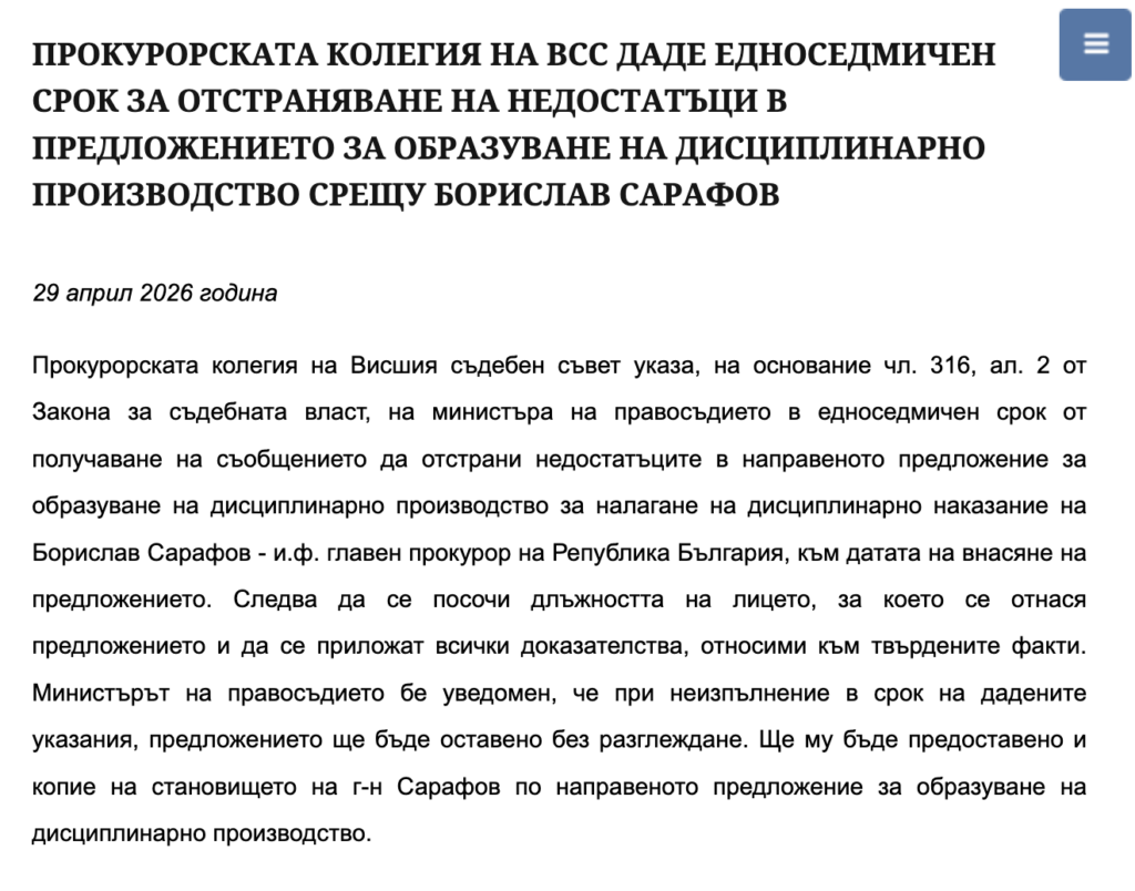Прокурорската колегия на Висшия съдебен съвет отказа да разгледа днес предложението правосъдния министър Янкулов за образуване на дисциплинарно производство срещу доскорошния и.ф. главен прокурор Борислав Сарафов. Кадровиците успяха да намерят „недостатъци“ в предложението, като непосочване точната длъжност на Сарафов и липса на доказателства за твърденията. Въз основа на „недостатъците“ те „върнаха“ предложението, като дадоха седемдневен срок на Янкулов да ги поправи, в противен случай то ще бъде оставено без разглеждане. Кадровиците отново демонстрираха, че тълкуват законите, както „дяволът чете Евангелието“: този път беше похитена нормата на чл. 316, ал. 2 от ЗСВ, според която „когато в предложението […] не се съдържа изложение в какво се състои дисциплинарното нарушение, съответно кои обстоятелства водят до определяне на дисциплинарно наказание […], съответната колегия на Висшия съдебен съвет не образува, съответно не продължава дисциплинарно производство, като на вносителя на предложението се съобщава да отстрани в едноседмичен срок допуснатите нередовности“.