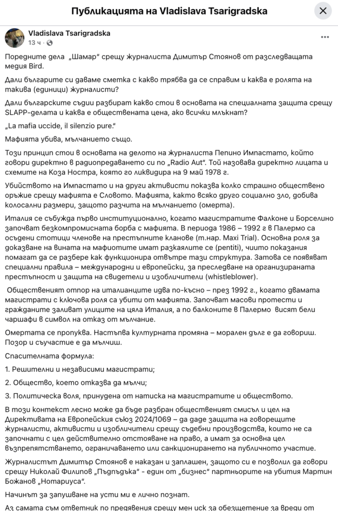 Съдия Владислава Цариградска публикува дълъг пост във Фейсбук в защита на свободата на словото и на журналиста Димитър Стоянов от Bird, срещу когото са заведени многобройните дела „шамари“. На фона на героични събития от борбата с мафията в Италия, съдията изброява нашумелите в последно време случаи, в които магистрати разкриват фрагменти на прогнилата българска съдебна система отвътре: това изобличителните прояви на Ивайло Занев, Ивайло Йосифов, Мирослав Петров, Владимир Николов, Теодора Георгиева.